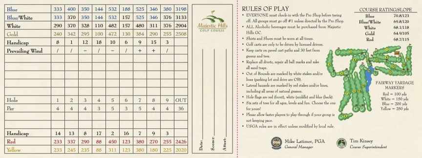 Majestic Hills is a challenging 18-hole Championship golf course with elevation changes on almost every hole. A Par 71 from all five sets of tees, offer an opportunity for a fun and competitive round to all levels and ages of golfers